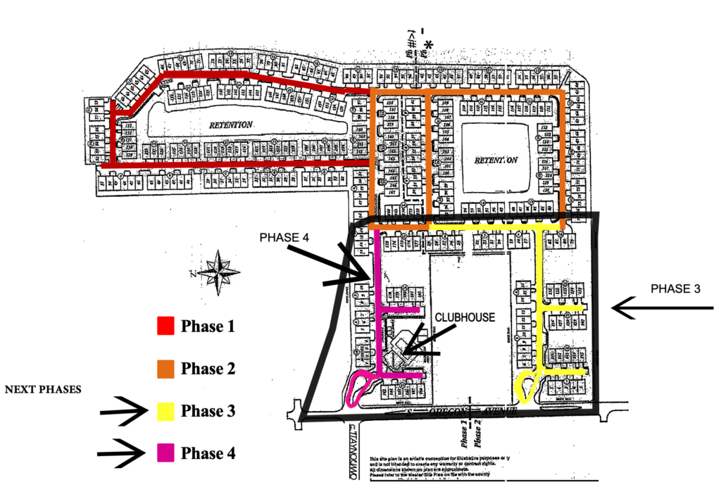 Phase 3 is currently being completed and we are scheduled for cleanup in Phase 4 this afternoon. As a reminder, please make sure to park only in areas that are completed. Refrain from parking in any guest parking or mailbox kiosk spaces as well as Phase 3 and Phase 4. Any vehicle found in these areas will be towed immediately.